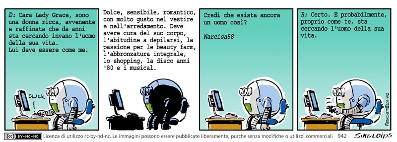 D: Cara Lady Grace, sono una donna ricca, avvenente e raffinata che da anni sta cercando invano l’uomo della sua vita. Lui deve essere come me. Dolce, sensibile, romantico, con molto gusto nel vestire e nell’arredamento. Deve avere cura del suo corpo, l’abitudine a depilarsi, la passione per le beauty farm, l’abbronzatura integrale, lo shopping, la disco anni ’80 e i musical. Credi che esista ancora un uomo così? Narcisa88 – R: Certo. E probabilmente, proprio come te, sta cercando l’uomo della sua vita.