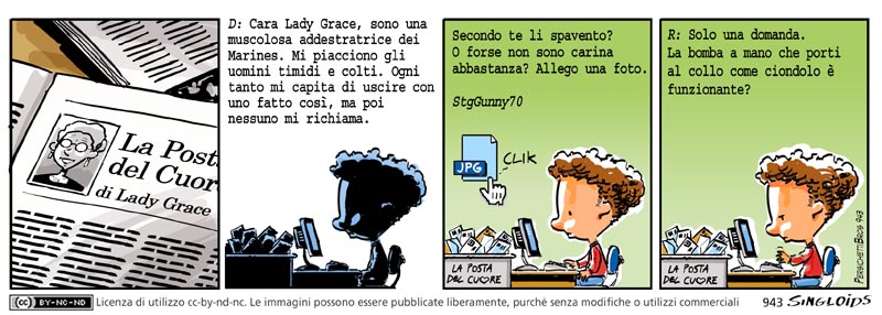 D: Cara Lady Grace, sono una muscolosa addestratrice dei Marines. Mi piacciono gli uomini timidi e colti. Ogni tanto mi capita di uscire con uno fatto così, ma poi nessuno mi richiama. Secondo te li spavento? O forse non sono carina abbastanza? Allego una foto. stgGunny70 – R: Solo una domanda. La granata che tieni al collo come ciondolo è funzionante?