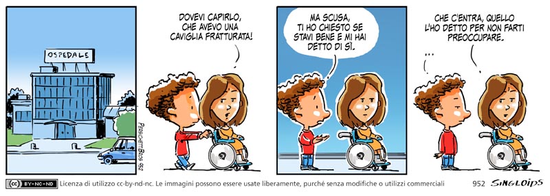 Ragazza: Avresti dovuto capirlo che avevo una caviglia fratturata. – Bob: Ma scusa, ti ho chiesto se stavi bene e mi hai detto di sì. – Ragazza: Che c’entra, quello l’ho detto per non farti preoccupare.
