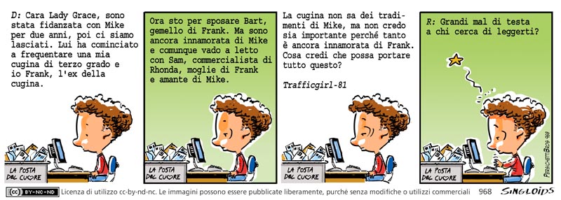 D: Cara Lady Grace, sono stata fidanzata con Mike per 2 anni, poi ci siamo lasciati. Lui ha comiciato a frequentare mia cugina di terzo grado, io Frank, l’ex della cugina. Ora sto per sposare Bart gemello di Frank, ma sono ancora innamorata di Mike e vado a letto con Sam, commercialista di Ronda, amante segreta di Mike. La cugina non sa dei tradimenti di Mike, ma non credo sia importante perché lei è innamorata di Frank. Cosa credi che possa portare tutto questo? Trafficgirl81 – R: Grandi mal di testa a chi cerca di leggerti?