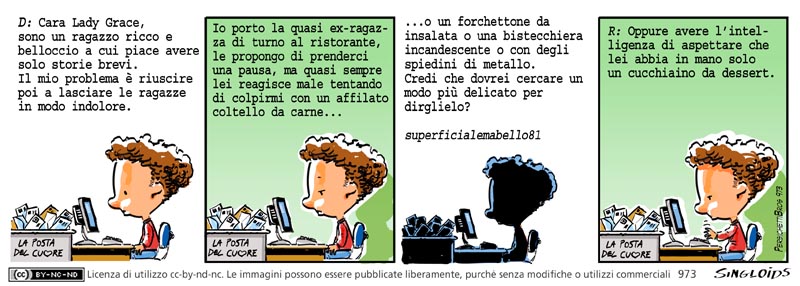 D: Cara Lady Grace, sono un ragazzo ricco e belloccio a cui piace avere solo storie brevi. Il mio problema è riuscire a lasciare le fidanzate in modo indolore. Io porto la ragazza di turno al ristorante, le propongo di prenderci una pausa, e spesso la quasi ex-fidanzata reagisce male tentando di colpirmi con un affilato coltello da carne o un forchettone da insalata o una bistecchiera incandescente o con spiedini di metallo. Credi che dovrei trovare un modo più delicato per dirglielo? superficialemabello81 – R: Oppure aspettare che lei abbia in mano solo un cucchiaino da dessert.