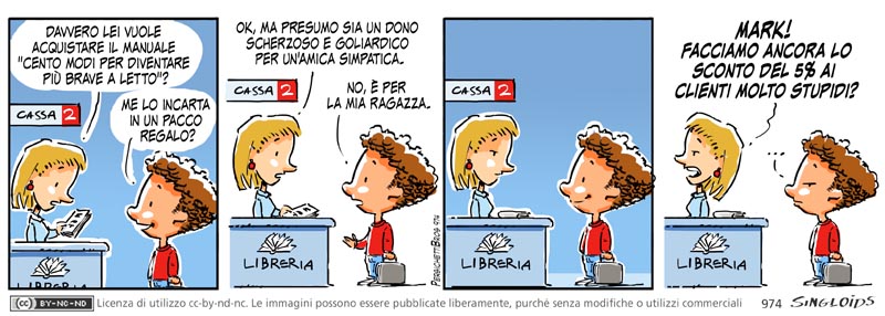 Cassiera: Davvero lei vuole acquistare il manuale “cento modi per diventare più brave a letto”? – Bob: Me lo incarta in un pacco regalo? – Cassiera: Ok, ma presumo sia un dono scherzoso e goliardico per un’amica simpatica. – Bob: No, è per la mia ragazza. – Cassiera: Mark! Facciamo ancora lo sconto del 5% ai clienti molto stupidi?