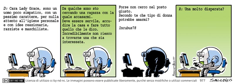 D: Cara Lady Grace, sono un uomo poco simpatico, con un pessimo carattere, per nulla attento all’igiene personale e con idee reazionarie, razziste e maschiliste. Da qualche anno sto cercando una ragazza con la quale accasarmi. Deve essere servile, accudire la casa e fare tutto quello che le dico. Incredibilmente non riesco a trovare nessuna interessata. Forse cerco nella tipologia sbagliata. Secondo te che tipo di donna potrebbe amarmi? – R: Una molto disperata?