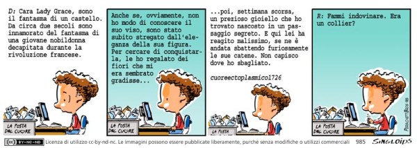 D: Cara Lady Grace, sono il fantasma di un castello. Da circa due secoli sono innamorato del fantasma di un giovane nobildonna decapitata durante la rivoluzione francese. Anche se ovviamente non ho modo di conoscere il suo viso, sono stato subito stregato dall’eleganza della sua figura. Per cercare di conquistarla, le ho regalato dei fiori che mi era sembrato gradisse e settimana scorsa, un prezioso gioiello che ho trovato nascosto in un passaggio segreto. Lei ha reagito malissimo, se ne è andata sbattendo in giro furiosamente le sue catene. Non capisco dove ho sbagliato. cuoreectoplasmico1726 – R: Fammi indovinare. Era un collier?