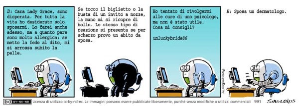 D: Cara Lady Grace, sono disperata. Per tutta la vita ho desiderato solo sposarmi. Lo farei anche adesso, ma sembro essere molto allergica. Se metto una fede al dito, mi si arrossa subito la pelle. Se tocco il biglietto o la busta di un invito a nozze, la mano mi si ricopre di bolle. Lo stesso tipo di reazione si presenta se per scherzo provo un abito da sposa. Ho tentato di rivolgermi alle cure di uno psicologo, ma non è stato utile. Cosa mi consigli? – R: sposa un dermatologo