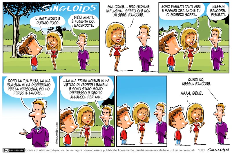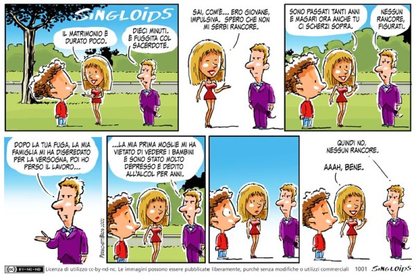 Pam: Siamo rimasti sposati per poco. – Mike: Dieci minuti dopo è fuggita col sacerdote. – Pam: Sai com’è… ero giovane, impulsiva. Spero non ci sia del rancore tra di noi. Sono passati tanti anni e magari ora anche tu ci scherzi sopra. – Mike: Nessun rancore, figurati. Dopo la tua fuga, la mia famiglia mi ha diseredato per la vergogna, ho perso il lavoro, la mia prima moglie mi vieta di vedere i bambini e sono stato molto depresso per anni. -Mike: Quindi, nessun rancore. – Pam: ah bene.