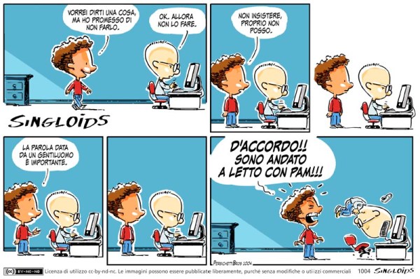 Bob: Vorrei dirti una cosa, ma ho promesso di non farlo. – Sid: Ok. Allora non lo fare. – Bob: Non insistere, proprio non posso. – Bob: La parola data è importante. – Bob: D’accordo! Ho fatto sesso con pam!
