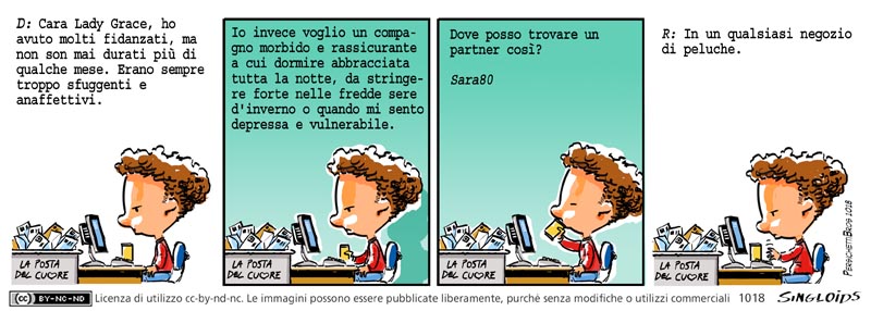 D: Cara Lady Grace, ho avuto molti fidanzati, ma non son mai durati più di qualche mese. Erano sempre troppo sfuggenti e anaffettivi. Io invece voglio un compagno morbido e rassicurante a cui dormire abbracciata tutta la notte, da stringere forte nelle fredde sere d’inverno o quando mi sento depressa e vulnerabile. Dove posso trovare un partner così? Sara80 – R: In un qualsiasi negozio di peluches.