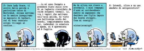 D: Cara Lady Grace, ti scrivo dalle gelide terre di Nortrobuk. Alcune settimane fa mentre inseguivamo una banda di ciclopi barbari, rea di aver razziato alcuni villaggi lungo il confine, mi sono fermato a prendere fiato sulle rive di uno laghetto riscaldato da calde sorgenti termali. Lì, tra i vapori che salivano nell’aria gelida, ho visto una bellissima ninfa dei boschi, completamente nuda. Lei vedendomi in armatura e spada si è spaventata ed è fuggita. Da allora non riesco a smettere di pensare a lei. I miei compagni d’arme mi ucciderebbero subito se sapessero che desidero una delle creature impure dei boschi stregati. Ma non riesco a smettere di desiderarla. Cosa mi consigli? Nordukol81 – R: Oltre a un uso smodato di antipsicotici?