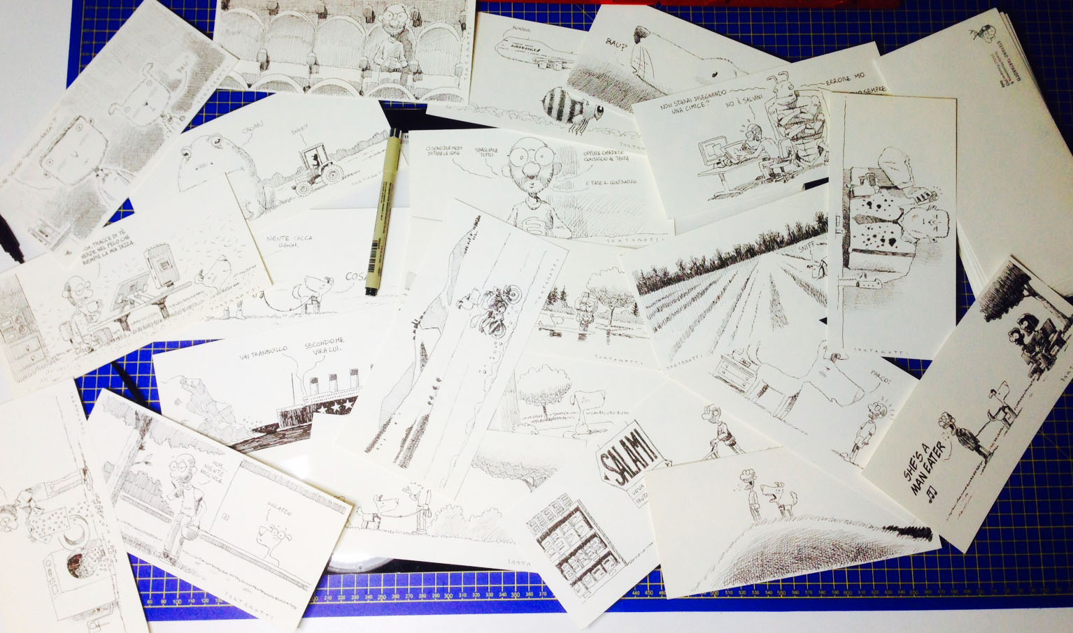 Sappiano che “tengono ragione”. Ho un poco sottovalutato la quantità di cartoline da disegnare. Ci sto lavorando febbrilmente consumando crème caramel scaduti per rimanere sveglio.