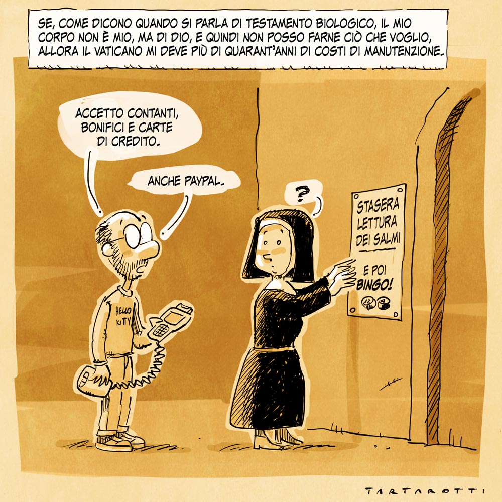 Almeno una buona notizia. La Corte Costituzionale ha deciso che il suicidio assistito non è sempre punibile e ha indicato i limiti in cui può essere agevolato. Cosa che, in questo paese, è un primo importante passo. Ma i vescovi già iniziano a roteare. Perché, chissà come mai, è sempre più facile fare i sostenitori del “tieni duro e soffri” quando non sei tu quello che agonizza senza possibilità di guarigione.