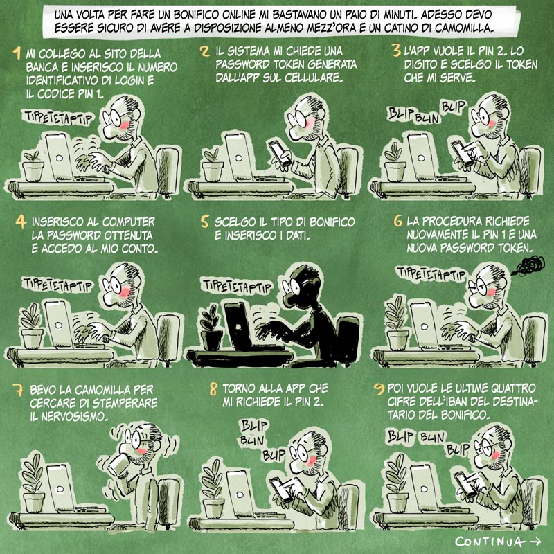 Qualche giorno fa ho effettuato un paio di bonifici online. A metà procedura volevo già morire. Alla fine ero tentato d’andare alla sede centrale della mia banca con un camion pieno di cimici.