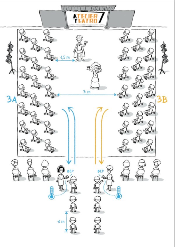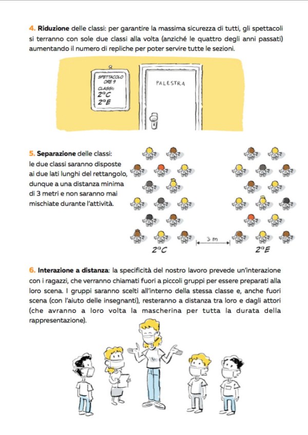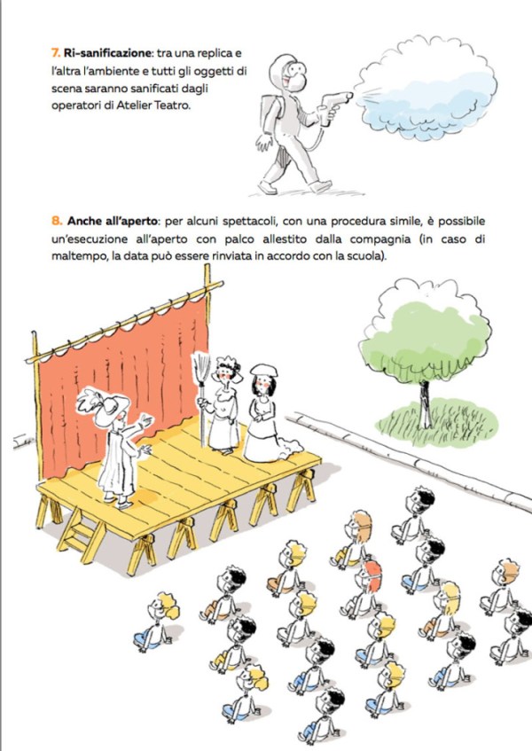 Per quei pazzi ma simpatici di Atelier Teatro ho fatto dei disegnini per quattro paginette mirate a mostrare come gestiranno il distanziamento nei loro spettacoli scolastici.Ho accettato solo a patto di poter scrivere “bep” un po’ dappertutto.
