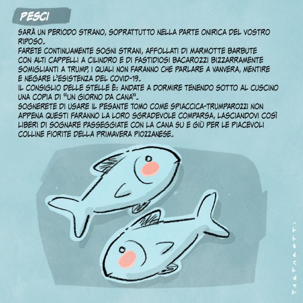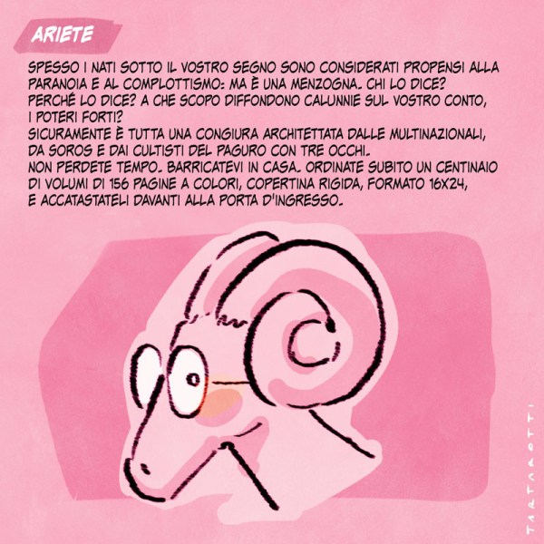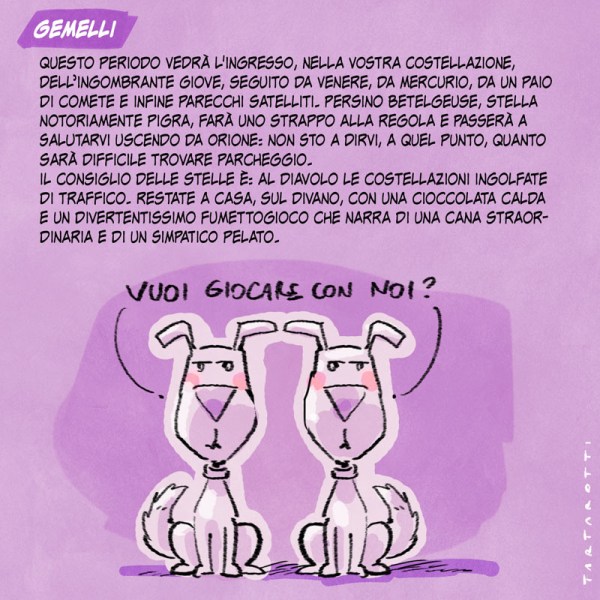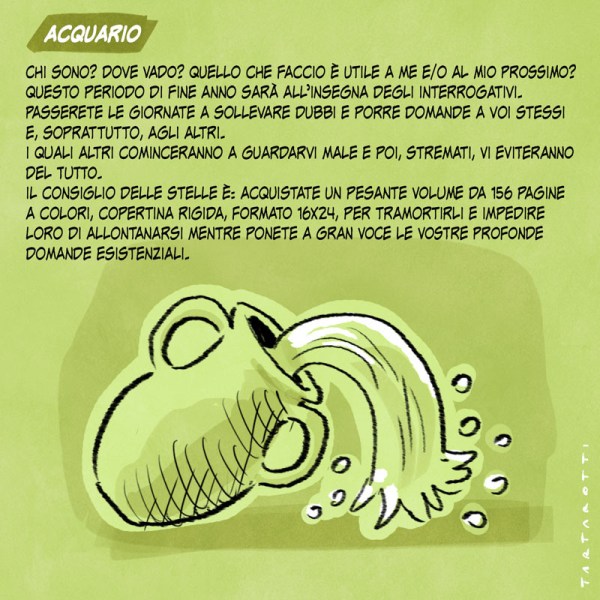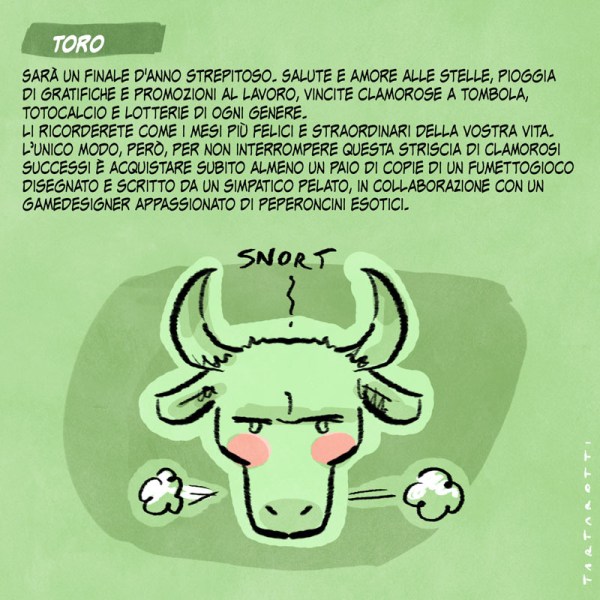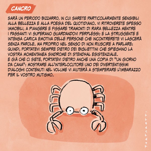 Solo ora mi rendo conto che da diverse settimane parlo solo del nuovo librogioco a fumetti “Un giorno da Cana”, di imminente uscita. E magari qualcuno comincia a trovare la cosa snervante.Tipo Gianpaolo, che avendone già prenotate un paio di copie, sta cominciando a minacciarmi di venire a sequestrare tutte le mie scorte di spaghetti scaduti da spezzare.Per questo motivo ho deciso di cambiare completamente argomento e di dilettarvi con un #tartascemoroscopo di tardo autunno.