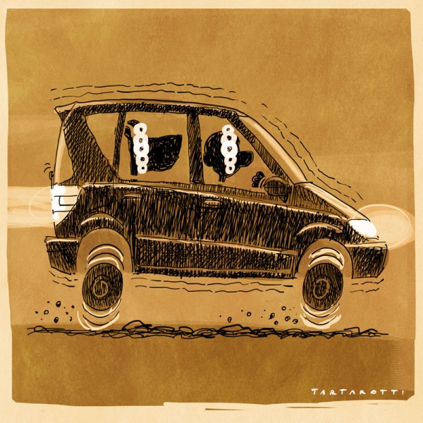 Oggi pomeriggio, se non piove, carico in auto la cana, la camicia di jeans (lavata) e gli stivali di gomma e vado a Grazzano Visconti (PC), dove, alla libreria Saphira in Piazza Giangaleazzo Visconti n°6, ci sarà (alle 15,30) l’ultimo firmacopie del canatour.Poi, appena tornato a casa, toglierò la batteria all’auto, disseppellirò gli album di Phil Collins e per un biennio conto di non uscire dalla Val Luretta.Metto questo disegno, ma credo che in realtà la strada per Grazzano non sia dissestata.
