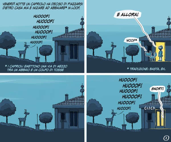 Venerdì notte un capriolo ha continuato ad abbaiare appena dietro casa facendo parecchio casino e svegliandomi più volte.Questa mini storia racconta fedelmente lo sviluppo della vicenda.Ok, sulla seconda parte non potrei giurare, perché continuavo a svegliarmi, riaddormentarmi e svegliarmi. Quindi potrei averla sognata (anche se lo escluderei).