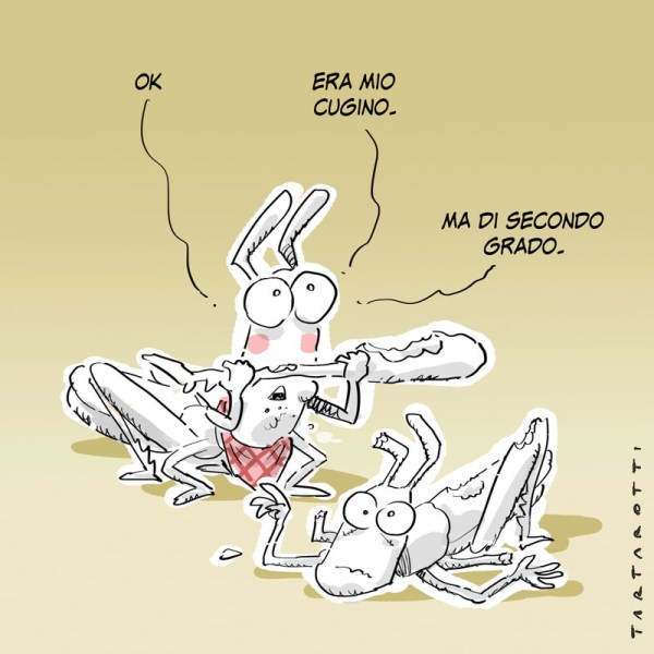 L’ho subito sgridata dicendole che essere cannibali è moralmente sbagliato e anche un poco scortese. Poi ho spazzato entrambe fuori, sul portico, dove la cavalletta ha potuto festeggiare la scampata condanna giudiziaria.