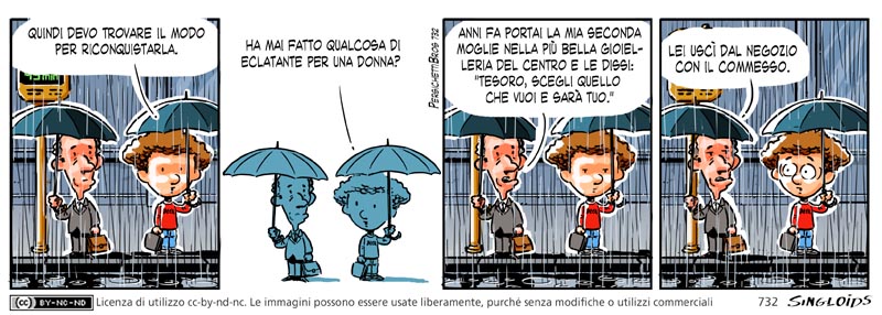 Bob: Quindi devo trovare il modo per riconquistarla. – Bob: Ha mai fatto qualcosa di eclatante per una donna? – Uomo alla fermata: Anni fa portai la mia seconda moglie nella più bella gioielleria del centro e le dissi: “Tesoro, scegli quello che vuoi e sarà tuo.” – Uomo alla fermata: Lei usci dal negozio con il commesso.