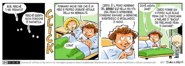 Jane: Bob, perché ti sei fermato? – Bob: Perché questa nuova posizione è fantastica. – Bob: Possiamo anche dire che è un vero e proprio upgrade virtuale della mia sessualità. – Jane: Cosa? – Bob: Certo. E’ il primo ingresso del sesso 2.0 nella mia vita. Ora, prima di riprendere,