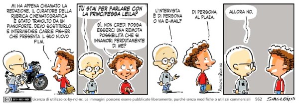 Bob: Mi ha appena chiamato la redazione. Il curatore della rubrica cinematografica è stato travolto da un pianoforte. Devo sostituirlo e intervistare Carrie Fisher che presenta il suo nuovo film. – Sid: TU stai per incontrare la principessa Leila? – Bob: Sì. Non pensi che ci possa essere una possibilità su un milione che si innamori perdutamente di me? – Sid: L’intervista è di persona o via e-mail? – Bob sorridente: Di persona, al Plaza. – Sid: Allora no.