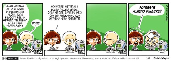 Pam: Ciao ragazzi, cosa state facendo? – Bob: Stiamo vedendo se è possibile addestrare iCoso in modo che ci porti birra e sigarette mentre lavoriamo al computer. – Pam: Ma come vi salta in mente? Per quanto ne sapete potrebbe essere il messaggero di una civiltà distante migliaia di anni luce! – iCoso: Registrazione TX48754: gli alieni del tipo denominato “donna” mostrano di possedere capacità di ragionamento superiori.