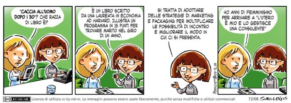 Gea: “Caccia all’uomo dopo i 30”? Che razza di libro è? – Meg: E’ un libro scritto da una laureata in economia ad Harvard. Illustra un programma in 15 punti per trovare marito nel giro di un anno. – Meg: Si tratta di adottare delle strategie di marketing e packaging per moltiplicare le possiblità di incontro e migliorare il modo in cui ci si presenta. – Gea: 40 anni di femminismo per arrivare a “L’utero è mio e lo gestisce una consulente”.